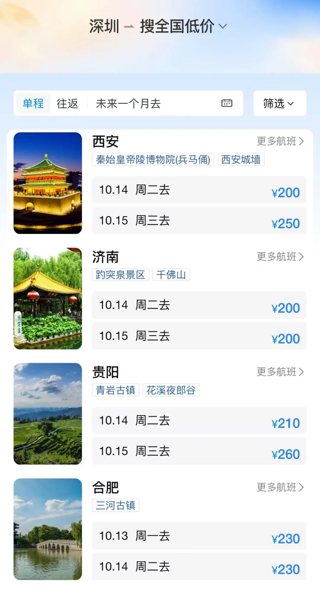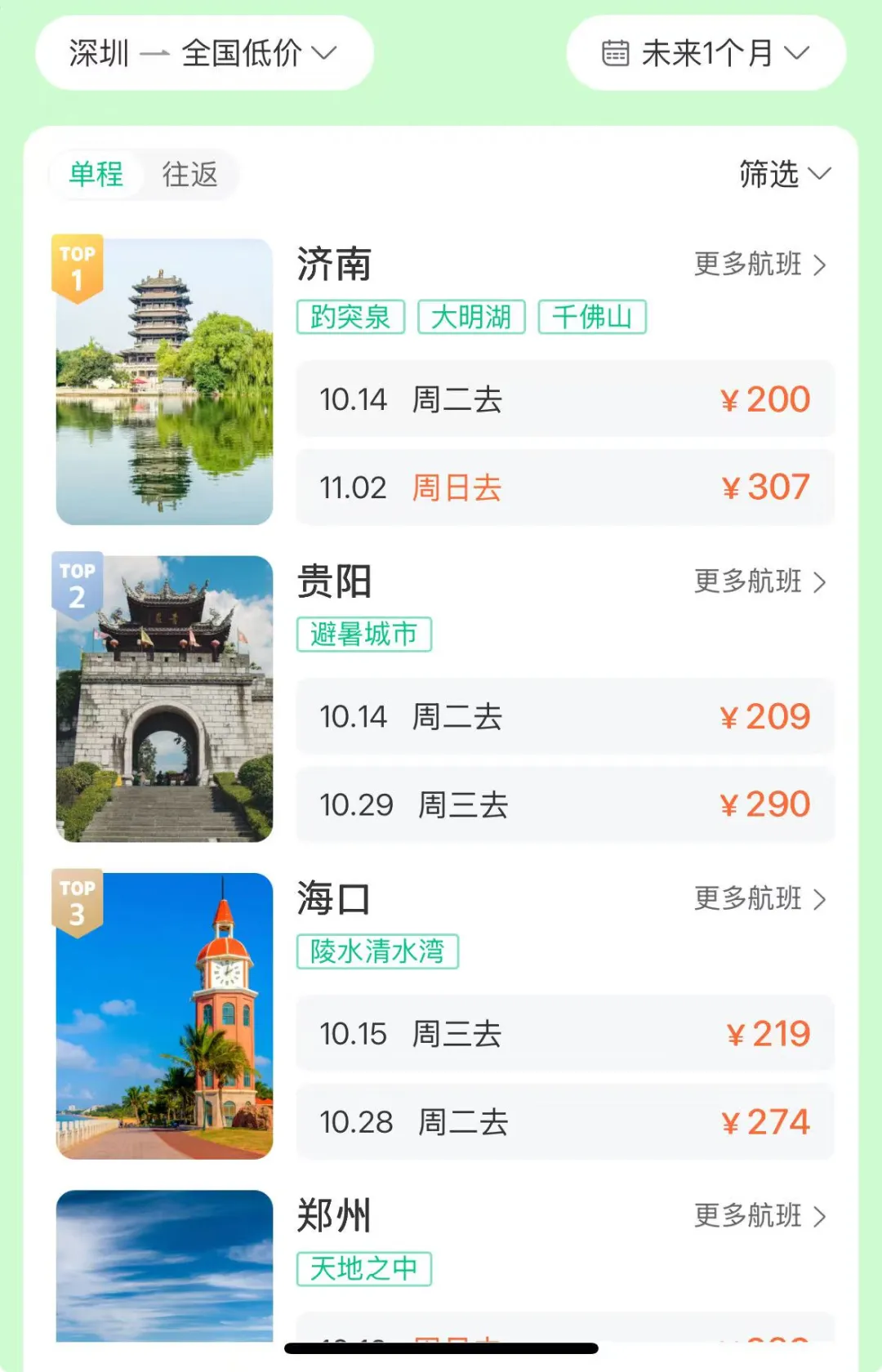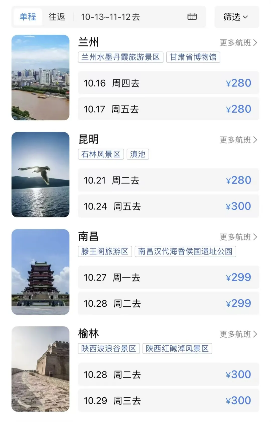飞多地单程票价