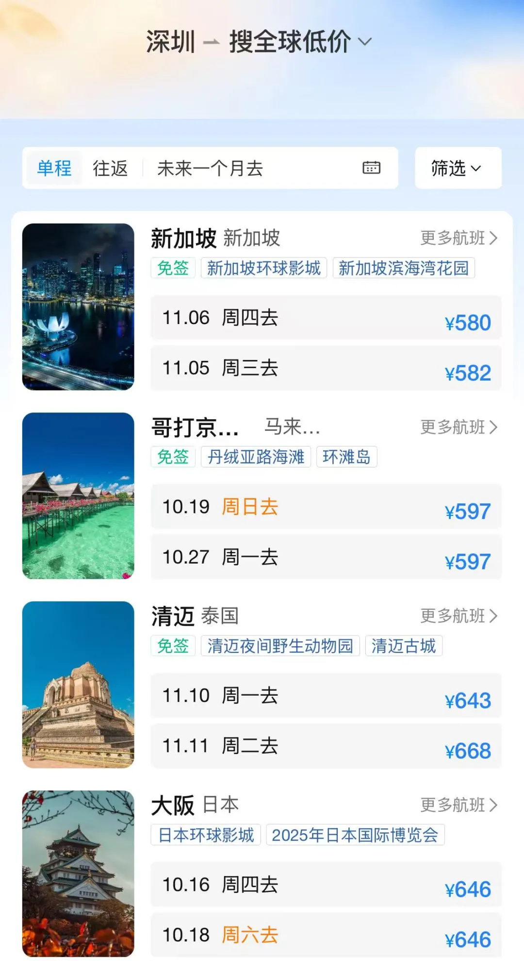 大阪、清迈等地的最低票价