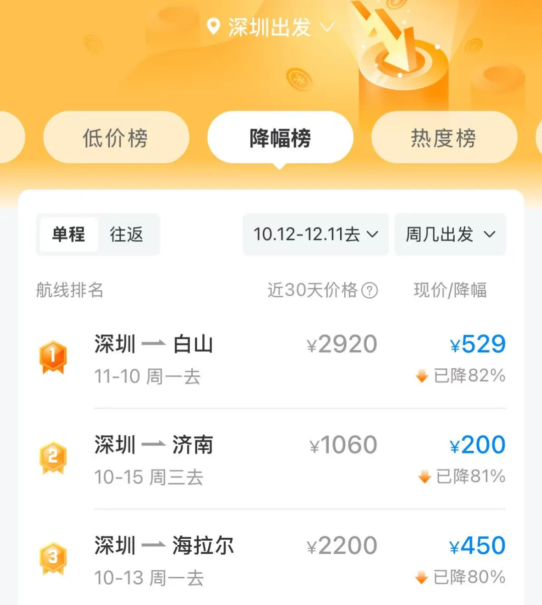单程机票价格低至200元